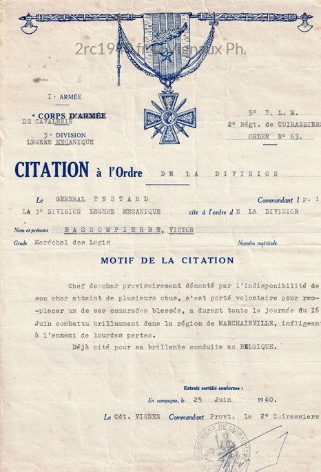 “Chef de char provisoirement démonté par l’indisponibilité de son char atteint de plusieurs obus, s’est porté volontaire pour remplacer un de ses camarades blessés, a durant toute la journée du 16 juin combattu brillamment dans la région de Marchainville, infligeant à l’ennemi de lourdes pertes. Déjà cité pour sa brillante conduite en Belgique.”