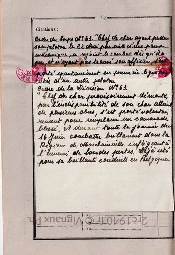 “Chef de char ayant perdu son peloton le 22 mai par suite d’une panne mécanique, a rejoint le combat dès qu’il a pu, et n’ayant pas trouvé son officier, s’est porté spontanément en première ligne aux côtés d’un autre peloton.”