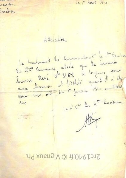 Le lieutenant Vié, commandant le 4ème Escadron du 2ème Régiment de Cuirassiers atteste que le Cuirassier Poussier René a toujours servi avec honneur et fidélité quand il a été sous ses ordres du 1er janvier 1940 au 1er août 1940.