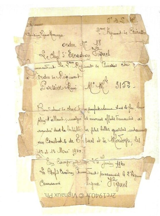 Citation à l’ordre du régiment de René Poussier portant la signature du chef d’escadron Vignes.